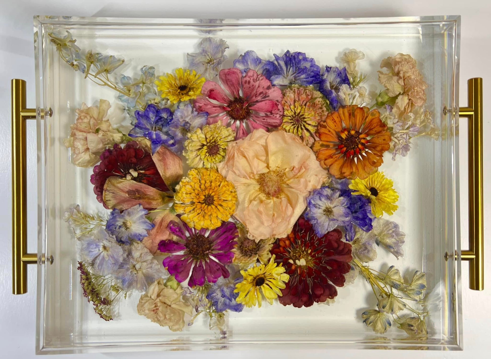 It is important to know that some flowers will fade during drying or pressing. For example, white will alter to beige, red will alter to maroon, light pink will alter to almost white. Resin will also naturally amber over time. Please keep out of sunlight and away from heat. We will offer color enhancement at our discretion in detrimental situations only.