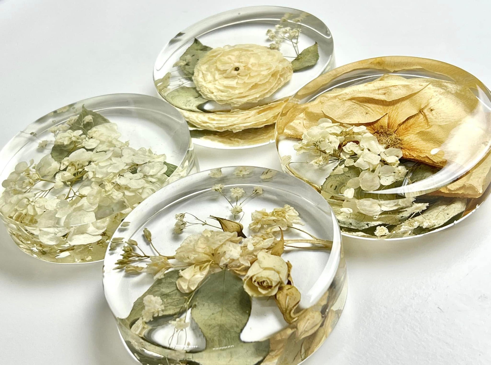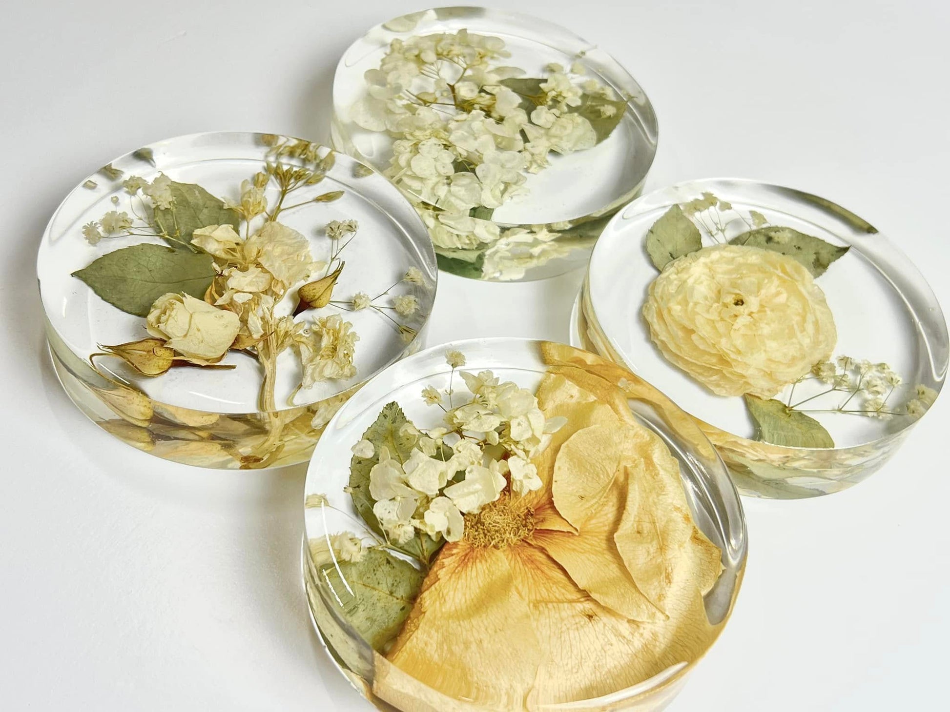 It is important to know that some flowers will fade during drying or pressing. For example, white will alter to beige, red will alter to maroon, light pink will alter to almost white. Resin will also naturally amber over time. Please keep out of sunlight and away from heat. We will offer color enhancement at our discretion in detrimental situations only.