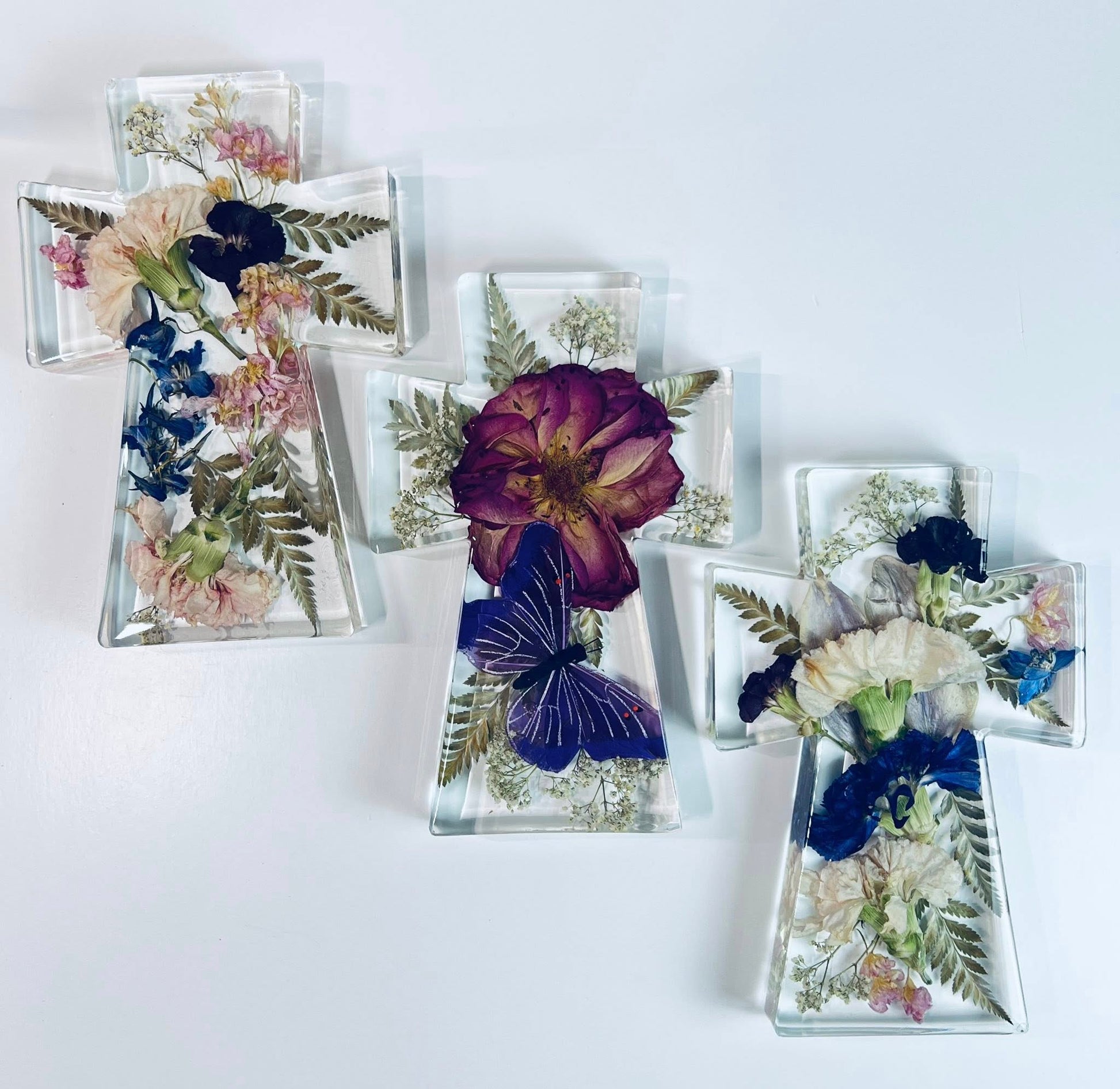 It is important to know that some flowers will fade during drying or pressing. For example, white will alter to beige, red will alter to maroon, light pink will alter to almost white. Resin will also naturally amber over time. Please keep out of sunlight and away from heat. We will offer color enhancement at our discretion in detrimental situations only.