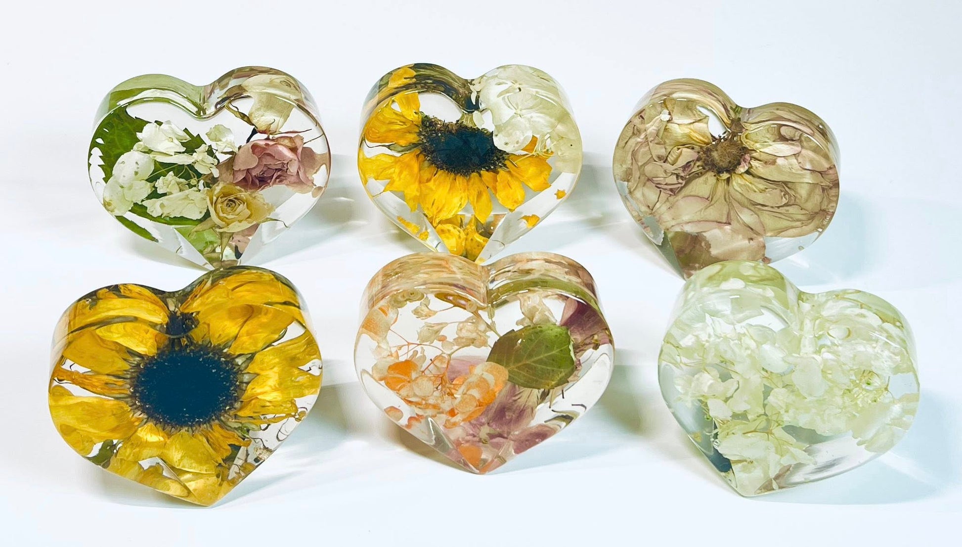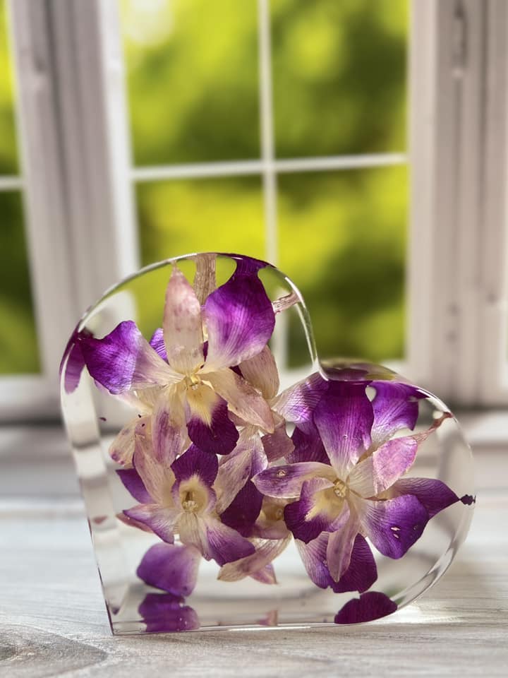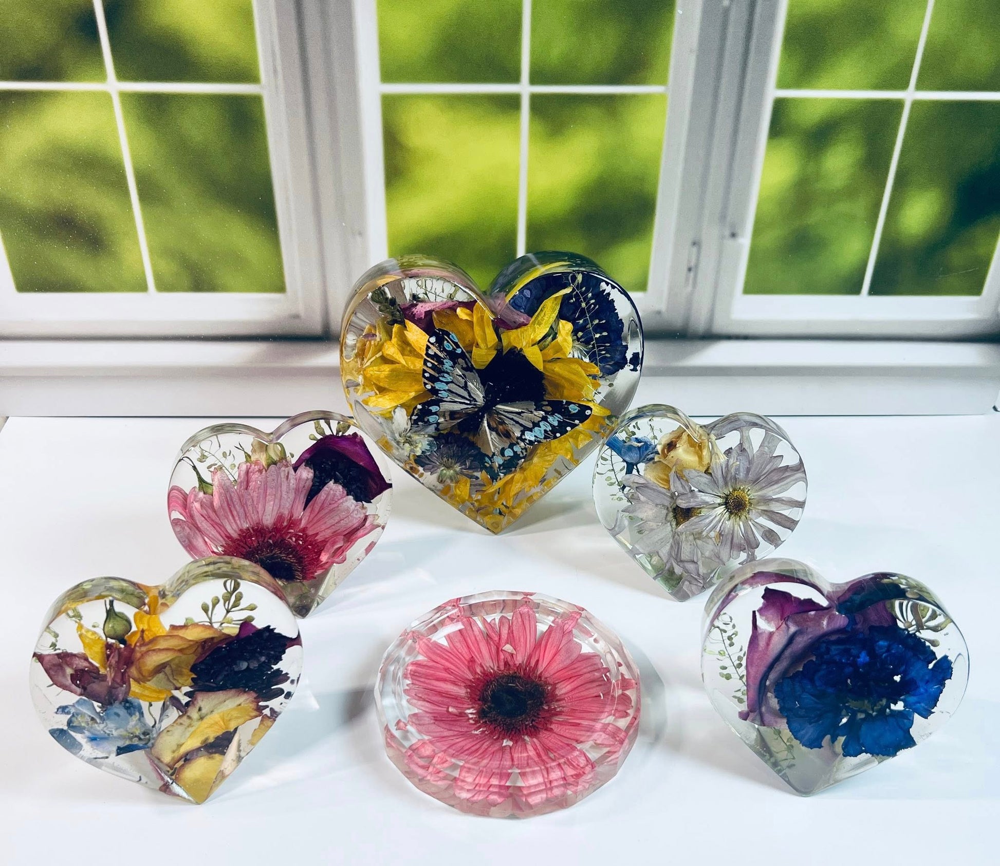 It is important to know that some flowers will fade during drying or pressing. For example, white will alter to beige, red will alter to maroon, light pink will alter to almost white. Resin will also naturally amber over time. Please keep out of sunlight and away from heat. We will offer color enhancement at our discretion in detrimental situations only.